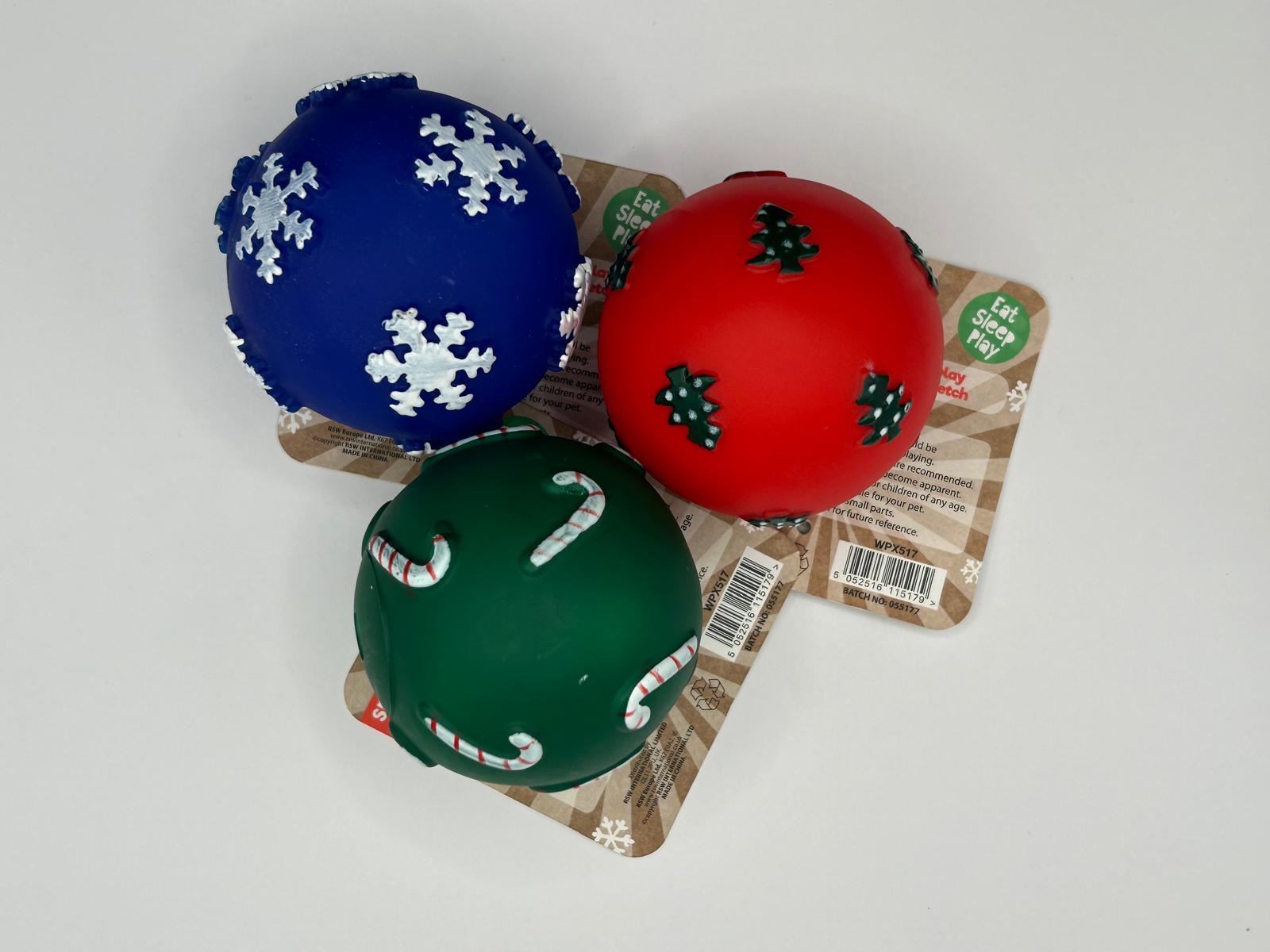 Candy, snowflake or Christmas tree squeaky vinyl ball will keep your fur baby entertained in the festive season